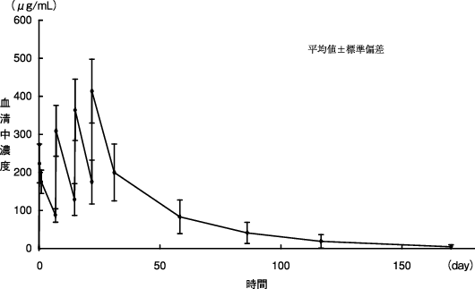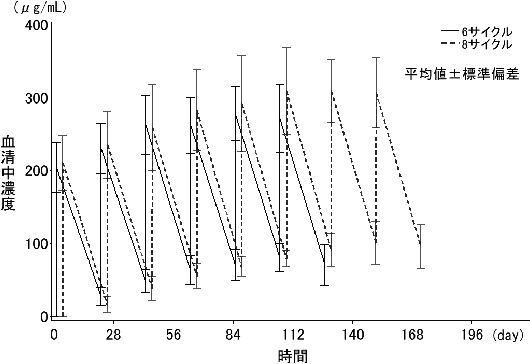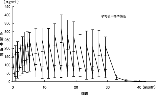 初回投与時に発現した副作用が軽微であった場合、100mg/時まで上げて投与を開始し、その後30分毎に100mg/時ずつ上げて、最大400mg/時まで上げることができる。なお、初回投与から6ヵ月目以降の投与の場合、6ヵ月毎に1回目の投与は「初回投与」の注入速度に従って投与すること。