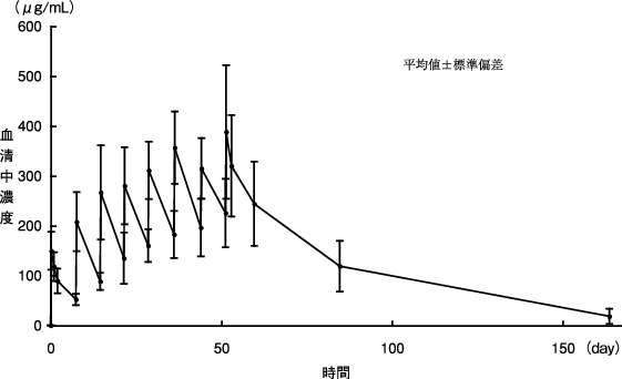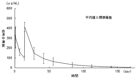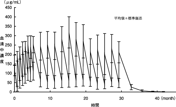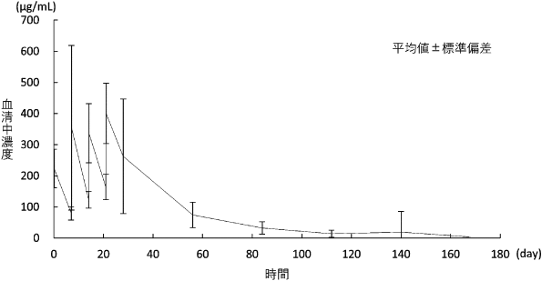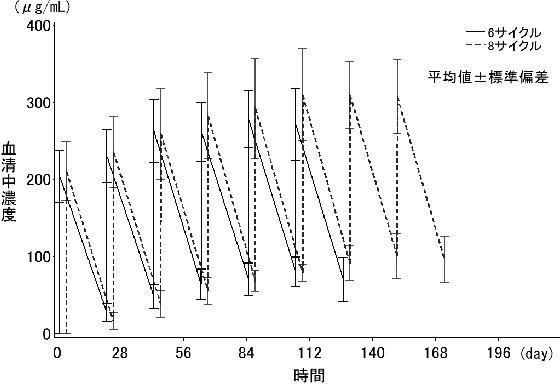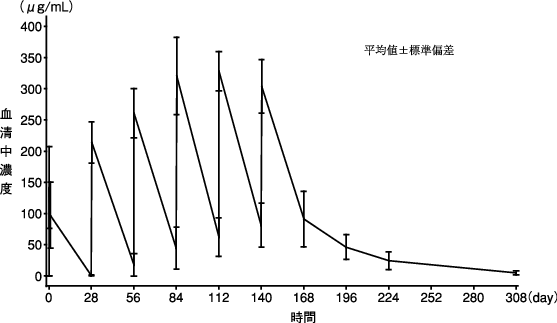 初回投与時に発現した副作用が軽微であった場合、100mg/時まで上げて投与を開始し、その後30分毎に100mg/時ずつ上げて、最大400mg/時まで上げることができる。なお、初回投与から6ヵ月目以降の投与の場合、6ヵ月毎に1回目の投与は「初回投与」の注入速度に従って投与すること。