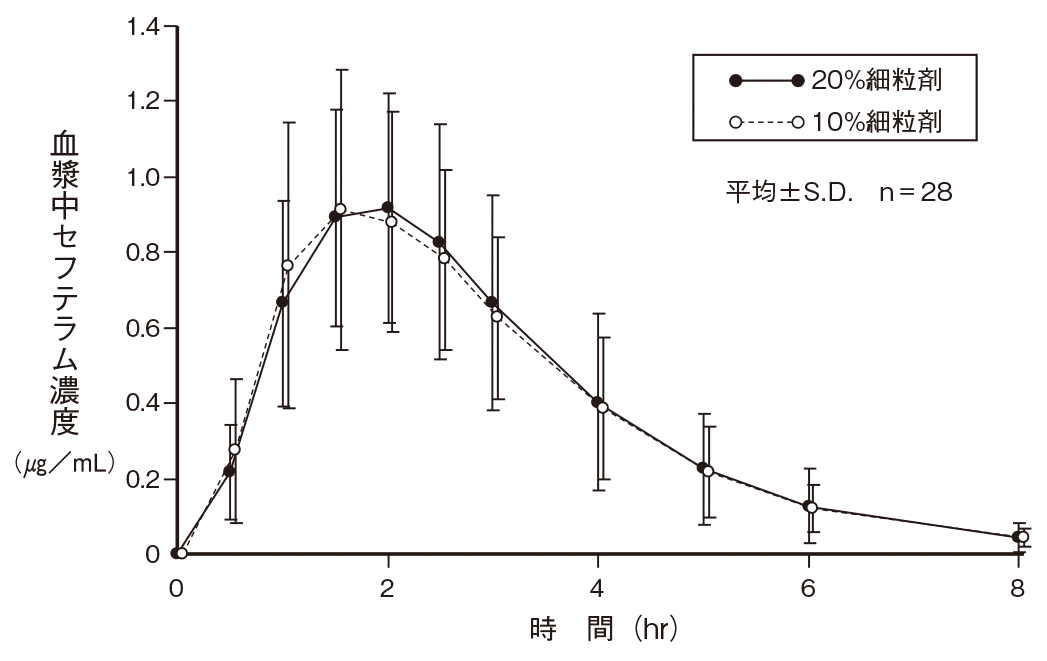 20%細粒剤と10%細粒剤をクロスオーバー法によりそれぞれ0.5gと1g(いずれもセフテラム ピボキシルとして100mg(力価))を健康成人男性28例に空腹時単回経口投与して血漿中セフテラム濃度を測定し、得られた薬物動態パラメータ(AUC、Cmax)について90%信頼区間法にて統計解析を行った結果、log(0.80)~log(1.25)の範囲内であり、両剤の生物学的同等性が確認された3) 。