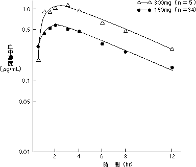 健康成人に150mg又は300mgを食後単回経口投与したときのトスフロキサシンの血中濃度は以下のとおりである4)。