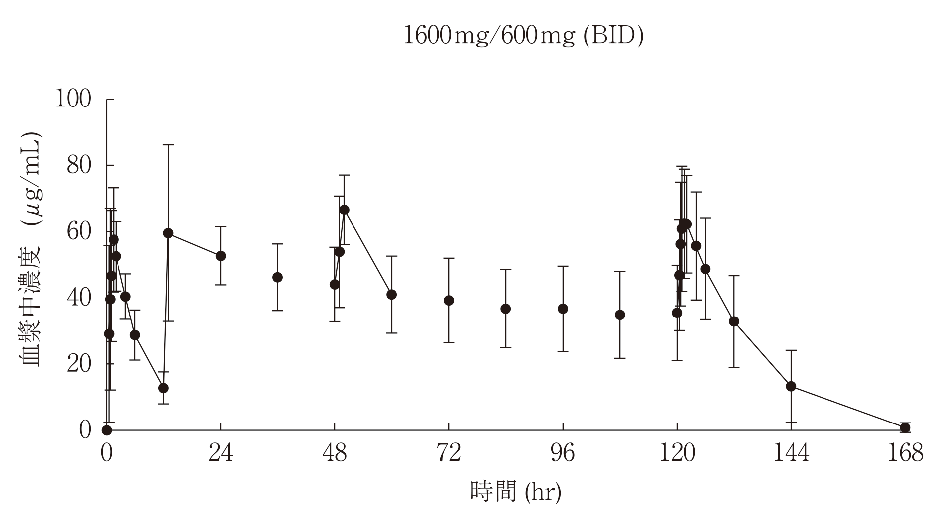 健康成人8例に本剤を1日目は1回1600mgを1日2 回、2日目から6日目は1回600mgを1日2回(6日目は1回のみ)経口投与(1600mg/600mg BID)したときの薬物動態パラメータは次のとおりであった。