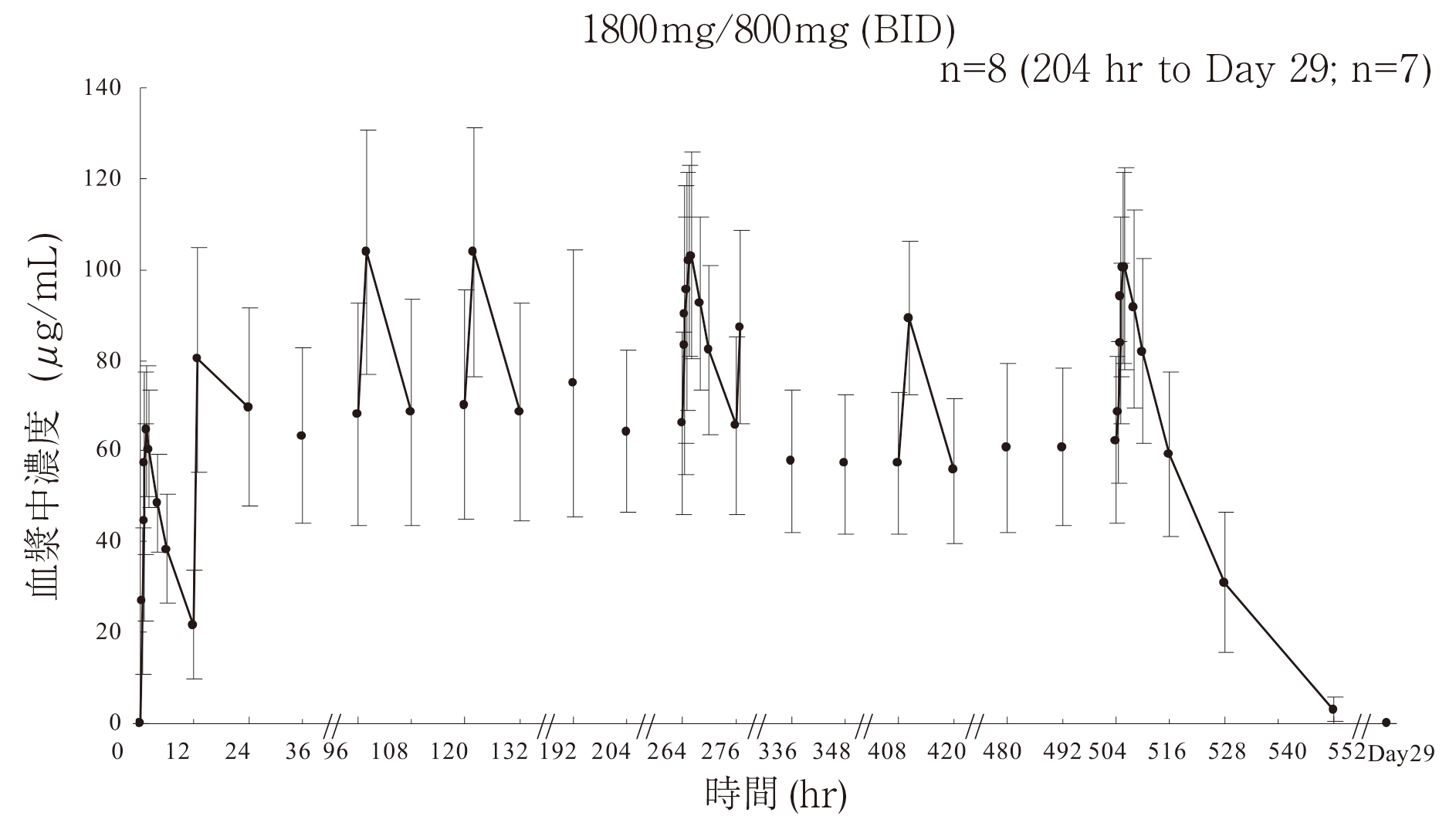 健康成人8例に本剤を1日目は1回1800mgを1日2回、2日目から22日目は1回800mgを1日2回(22日目は1回のみ)経口投与(1800mg/800mg BID)したときの薬物動態パラメータは次のとおりであった9) 。