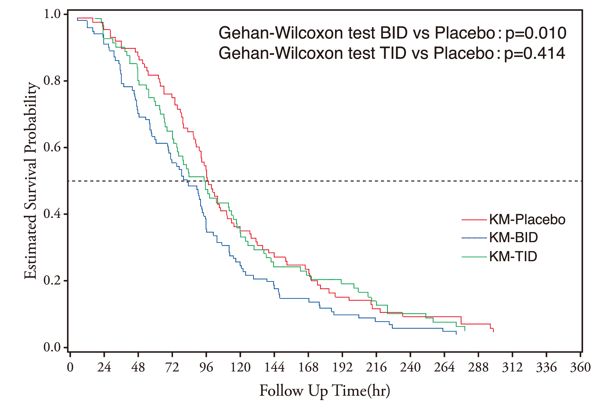A型又はB型インフルエンザウイルス感染症患者(成人)を対象として、プラセボを対照とした第I/Ⅱ相試験[本剤を1日目は1回1800mgを1日2回、2日目から5日目は1回800mgを1日2回経口投与(1800mg/800mg BID)及び本剤を1日目初回は2400mg、2回目及び3回目は1回600mg、2日目から5日目は1回600mgを1日3回経口投与(2400mg/600mg TID)]注15) を実施した。主要評価項目である罹病期間注16) について、プラセボ群(88例)と本剤1800mg/800mg BID群(101例)との対比較では、統計学的に有意な差が認められたが(p=0.01、Gehan-Wilcoxon test)、本剤2400mg/600mg TID群(82例)との対比較では、統計学的に有意な差は認められなかった(p=0.414、Gehan-Wilcoxon test)。本剤群において、副作用は認められなかった。