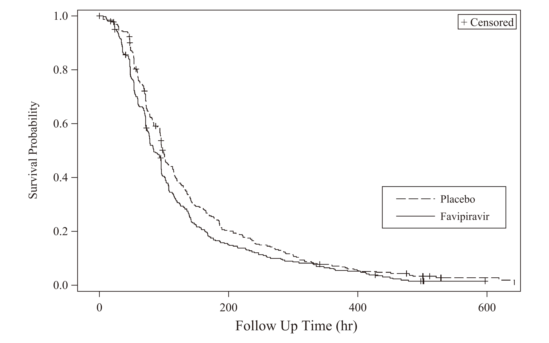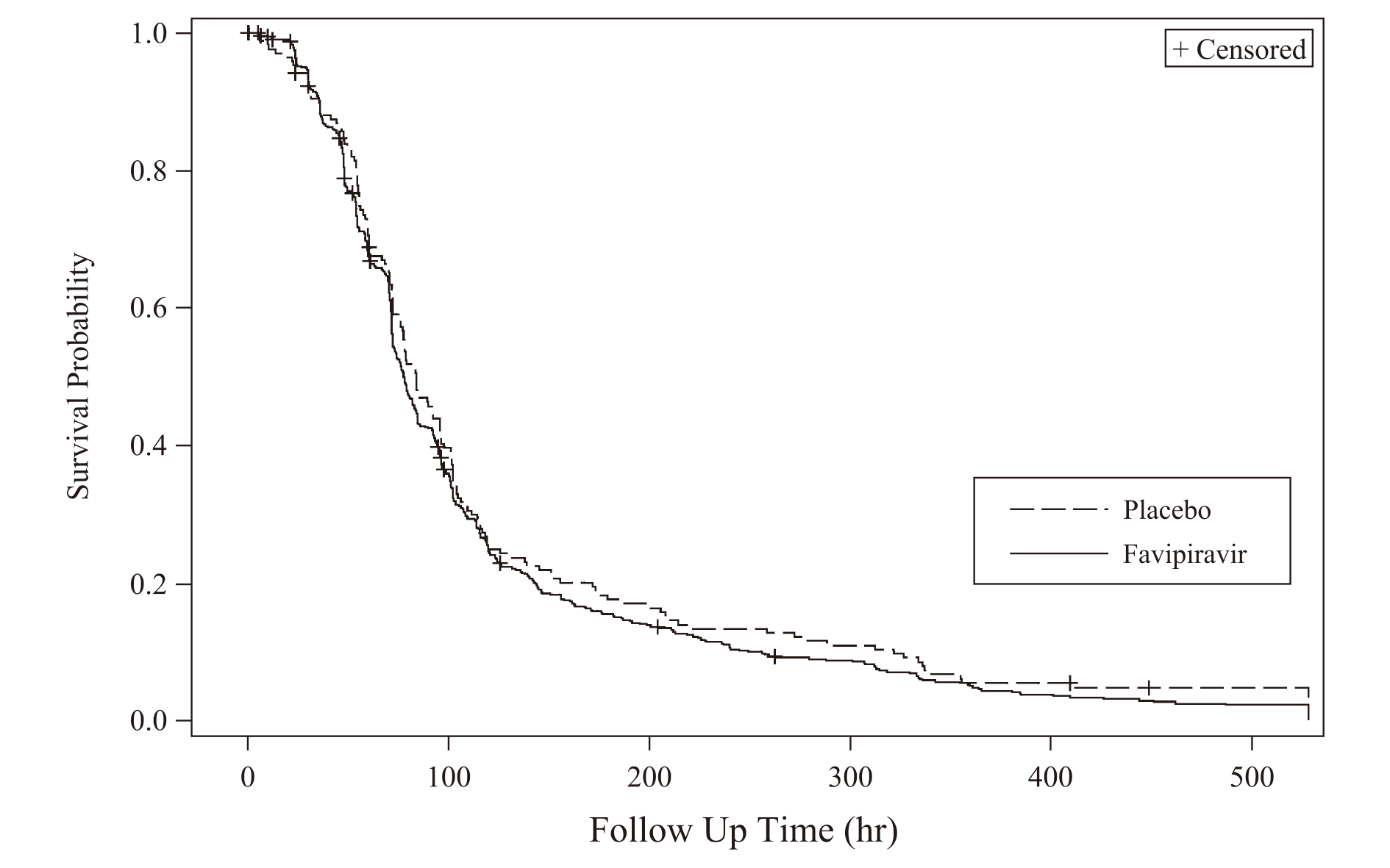 A型又はB型インフルエンザウイルス感染症患者(成人)を対象として、プラセボを対照とした海外第Ⅱ相試験[本剤を1日目は1回1000mgを1日2回、2日目から5日目は1回400mgを1日2回経口投与(1000mg/400mg BID)、本剤を1日目は1回1200mgを1日2回、2日目から5日目は1回800mgを1日2回経口投与(1200mg/800mg BID)及びプラセボを1日2回経口投与]注15) を実施した。インフルエンザ主要症状罹病期間注19) の中央値[95%信頼区間]は、本剤1000mg/400mg BID群(88例)で100.4[82.4,119.8]時間、本剤1200mg/800mg BID群(121例)で86.5[79.2,102.1]時間、プラセボ群(124例)で91.9[70.3,105.4]時間であり、プラセボ群との対比較において、本剤群のいずれにおいても、統計学的に有意な差は認められなかった(p>0.05、Gehan-Wilcoxon test、検定の多重性はStep-down法で調整)。