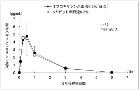 オフロキサシン点眼液0.3%「日点」とタリビッド点眼液0.3%を、それぞれ50μL(オフロキサシンとして、0.15mg)ウサギの眼結膜嚢内に点眼して眼房水中オフロキサシン濃度を測定したところ、各測定時点の濃度に有意差は認められなかったことから両剤の生物学的同等性が確認された(t検定)3)。