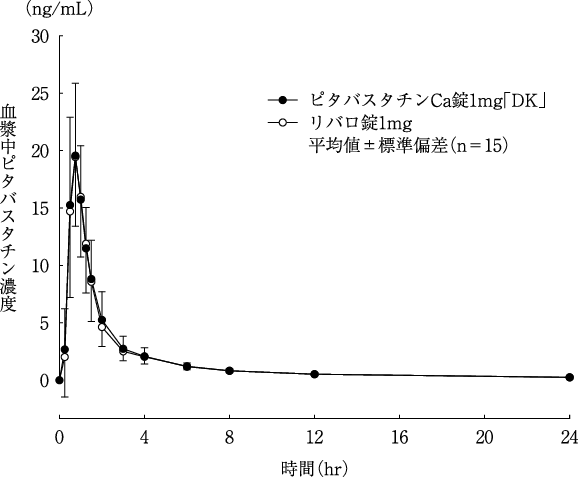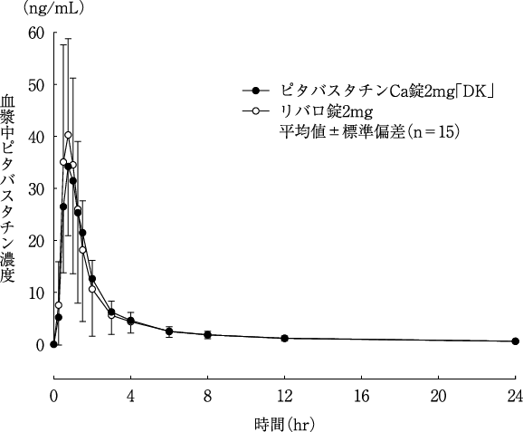 ピタバスタチンCa錠2mg「DK」とリバロ錠2mgを、クロスオーバー法によりそれぞれ1錠(ピタバスタチンカルシウムとして2mg)健康成人男子に絶食単回経口投与して血漿中ピタバスタチン濃度を測定し、得られた薬物動態パラメータ(AUC、Cmax)について90%信頼区間法にて統計解析を行った結果、log(0.80)~log(1.25)の範囲内であり、両剤の生物学的同等性が確認された3)。