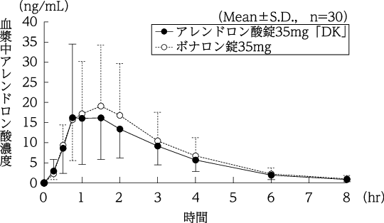 アレンドロン酸錠35mg「DK」とボナロン錠35mgを、クロスオーバー法によりそれぞれ1錠(アレンドロン酸として35mg)健康成人男子に絶食単回経口投与して血漿中アレンドロン酸濃度を測定し、得られた薬物動態パラメータ(AUC、Cmax)について統計解析を行った結果、判定パラメータの対数値の平均値の差がlog(0.90)~log(1.11)の範囲内であり、且つ、溶出試験で溶出挙動が類似していると判定されたことから、両剤の生物学的同等性が確認された3)。