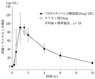 ベポタスチンベシル酸塩錠10mg「DK」とタリオン錠10mgを、クロスオーバー法によりそれぞれ1錠(ベポタスチンベシル酸塩として10mg)健康成人男子に絶食単回経口投与して血漿中ベポタスチン濃度を測定し、得られた薬物動態パラメータ(AUC、Cmax)について90%信頼区間法にて統計解析を行った結果、log(0.80)~log(1.25)の範囲内であり、両剤の生物学的同等性が確認された4)。