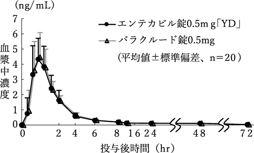 エンテカビル錠0.5mg「YD」とバラクルード錠0.5mgを、クロスオーバー法によりそれぞれ1錠(エンテカビルとして0.5mg)健康成人男子20名に絶食単回経口投与して血漿中の未変化体濃度を測定した。得られた薬物動態パラメータ(AUC、Cmax)について90%信頼区間法にて統計解析を行った結果、log(0.80)~log(1.25)の範囲内であり、両剤の生物学的同等性が確認された3)。