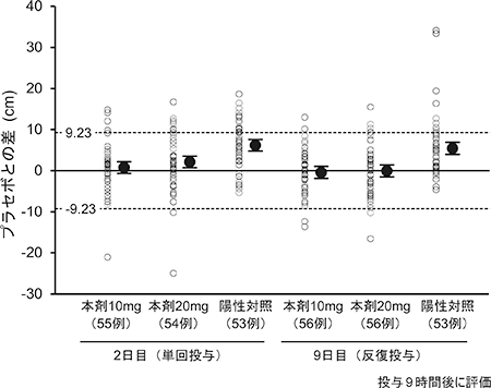 60分間累積SDLPの陽性対照投与期とプラセボ投与期との差の90%信頼区間の上限は閾値(9.23cm)未満であったものの、いずれの評価時期においても90%信頼区間の下限が0を超え、本試験は分析感度を有していることが示された。本剤投与については、単回投与及び8日間投与の翌朝(投与から9時間後)における60分間累積SDLPのプラセボとの差は、本剤10mg投与期及び本剤20mg投与期の単回及び反復投与で、いずれも90%信頼区間の上限が事前に設定した閾値(9.23cm)未満であったが、本剤20mgの単回投与で90%信頼区間の下限は0を上回っていた。60分間累積SDLPの本剤投与期とプラセボ投与期との差が9.23cm以上であった被験者は、本剤10mg投与期の2及び9日目(以下同順)でそれぞれ7.3%(4/55例)及び3.6%(2/56例)、本剤20mg投与期で20.4%(11/54例)及び8.9%(5/56例)、陽性対照投与期では32.1%(17/53例)及び20.8%(11/53例)であった13)。