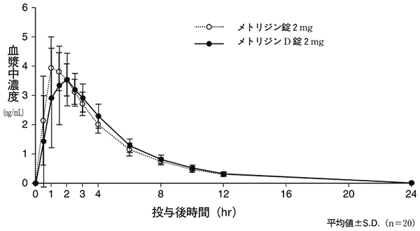 健康成人を対象としたクロスオーバー法による、メトリジンD錠2mgとメトリジン錠2mgの生物学的同等性試験を行った。その結果、活性本体の血漿中濃度は両剤形間で同様の推移を示し、メトリジンD錠2mgとメトリジン錠2mgは生物学的に同等であることが確認された3) 。