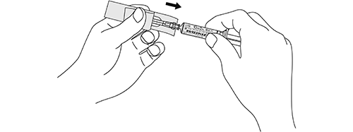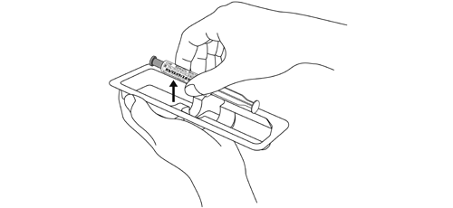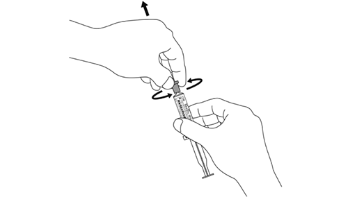 注意:キャップを矢印の方向にねじりながらゆっくりと引き外す。キャップを外した後、シリンジ先端部に触れないこと。