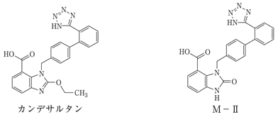 カンデサルタン シレキセチルはカルボキシルエステラーゼにより活性代謝物カンデサルタンに代謝され、さらに一部がCYP2C9により非活性代謝物M-Ⅱに代謝されるが、本態性高血圧症患者にカンデサルタン シレキセチルを投与したときのM-Ⅱの血中濃度及び尿中排泄率はカンデサルタンの血中濃度及び尿中排泄率に比べ低く、CYP2C9の遺伝的多型によるカンデサルタンの血中濃度への影響は少ないと考えられる。また、カンデサルタンはCYP1A1、1A2、2A6、2B6、2C8、2C9-Arg、2C19、2D6、2E1、3A4の代謝活性を阻害しない(in vitro)。