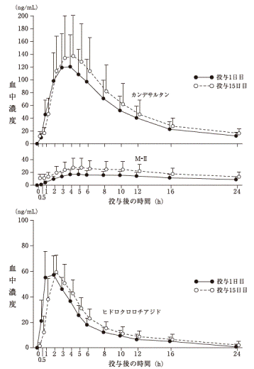 本態性高血圧症患者10例に1日1回カンデサルタン シレキセチル/ヒドロクロロチアジドとして8mg/6.25mgを15日間反復投与した時、尿中には未変化体であるカンデサルタン シレキセチルは検出されず、活性代謝物カンデサルタン、非活性代謝物M-Ⅱ及びヒドロクロロチアジドが排泄される。投与24時間までの尿中カンデサルタン+M-Ⅱ及びヒドロクロロチアジド未変化体の累積尿中排泄率はカンデサルタン+M-Ⅱが投与1日目12.3%、15日目15.8%、ヒドロクロロチアジド未変化体が投与1日目71.1%、15日目80.4%である。