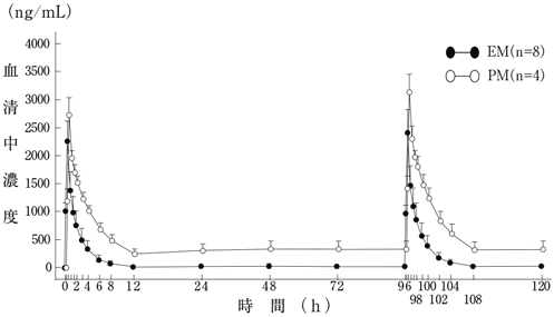 本剤の静脈内投与における血清中濃度には個体間で差が認められる。CYP2C19の遺伝子タイプにより、本剤が速やかに代謝される群(Extensive Metabolizer:EM)と緩やかに代謝される群(Poor Metabolizer:PM)に分類した健康成人男子12例(EM:8例、PM:4例)を対象として、1回30mg1日2回を5日間点滴静注した場合の血清中濃度は以下のとおりである4)。