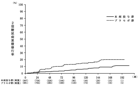 耐糖能異常を有し、かつ高血圧症、高脂血症、肥満(Body Mass Index:BMI 25kg/m2以上)あるいは2親等以内の糖尿病家族歴のいずれかを有する者を対象に、食事療法・運動療法に加えて1回0.2mgを1日3回投与した二重盲検比較試験(平均投与日数336.7±254.0日間)の結果、最終評価時点における2型糖尿病移行例数は、本剤投与群で50/897例、プラセボ群で106/881例である。プラセボ群に対する本剤投与群のハザード比(両側95%信頼区間)は0.595(0.4334-0.8177)である(層別ログランク検定:p=0.0014)21)。なお、2型糖尿病累積移行率は図表のとおりである。