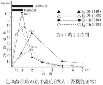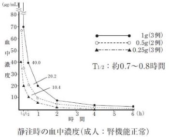主として腎より排泄され、成人(腎機能正常者)に1回0.5、1、2g静注あるいは点滴静注後6時間までの尿中排泄率は約60~75%である。また、0.5gを静注後の尿中濃度は0~2時間で約2,000μg/mL、2~4時間で約350μg/mL、4~6時間で約66μg/mLを示す3),4)。小児(腎機能正常者)に1回10、20、40mg/kg静注あるいは点滴静注後6時間までの尿中排泄率は、成人とほぼ同様である5),6),7)。