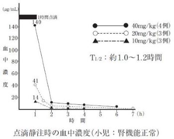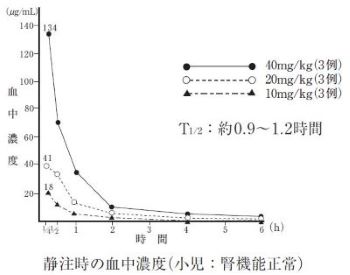 腎機能正常の成人及び小児に静注あるいは点滴静注して得られた血中濃度は以下のとおりであり、用量依存性を示す3),4),5),6),7),8),9),10),11)。
