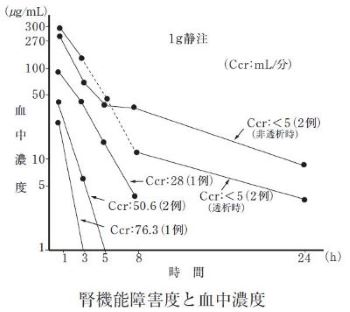 腎機能の低下に伴い、血中濃度の上昇、半減期の延長及び尿中排泄率の低下が認められる。従って、腎機能障害者に本剤を投与する場合には、投与量、投与間隔の適切な調節が必要である24)。