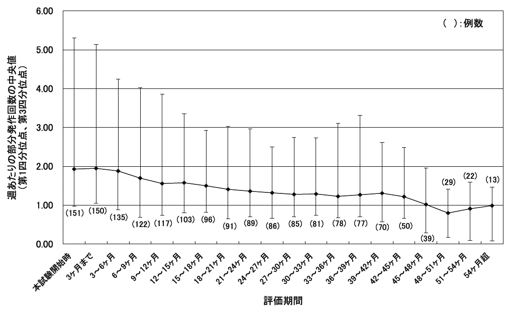 国内第Ⅱ/Ⅲ相試験(成人、併用療法)を完了した患者151例を対象として、レベチラセタム1000~3000mg/日を1日2回に分けて経口投与したときの部分発作回数は以下のとおりであった34),35),36) 。本試験に参加した被験者のうち、76例がその後計画された継続試験に移行し本試験を終了した(24~36ヵ月で1例、36~48ヵ月で47例、48ヵ月以降で28例)。