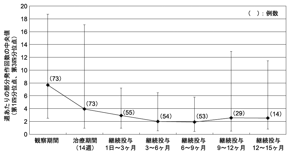 既存の抗てんかん薬で十分な発作抑制効果が得られない部分発作を有する4歳以上16歳未満の小児てんかん患者73例を対象として、レベチラセタム40又は60mg/kg/日(体重50kg以上は2000又は3000mg/日)を1日2回に分けて14週間経口投与(既存の抗てんかん薬との併用)したとき、主要評価項目である観察期間からの週あたりの部分発作回数減少率の中央値(95%信頼区間)は、43.21% (26.19%,52.14%)であり、発作頻度の減少が認められた。また、小児てんかん患者55例に14週以降もレベチラセタム20~60mg/kg/日(体重50kg以上は1000~3000mg/日)を1日2回に分けて継続投与したときの部分発作回数は以下のとおりであった37) 。