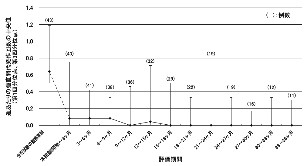 国際共同第Ⅲ相試験若しくは小児国内第Ⅲ相試験を完了、又は国際共同第Ⅲ相試験を効果不十分のため投与20週以降に中止した日本人患者44例を対象として、成人(16歳以上)ではレベチラセタム1000~3000mg/日、小児ではレベチラセタム20~60mg/kg/日(体重50kg以上は1000~3000mg/日)を経口投与したとき、週当たりの強直間代発作回数は以下のとおりであった40),41) 。