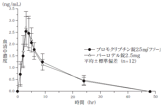 健康成人男性にブロモクリプチン錠2.5mg「フソー」とパーロデル錠2.5mgのそれぞれ1錠(ブロモクリプチンとして2.5mg)を、絶食時に単回経口投与して血清中総ブロモクリプチン濃度を測定し、得られた薬物動態パラメータ(Cmax、AUC)について分散分析にて統計解析を行った結果、両剤の生物学的同等性が確認された(クロスオーバー法)3) 。