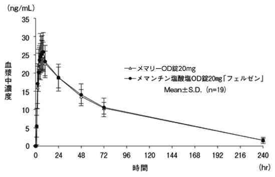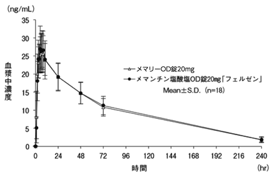 健康成人にメマンチン塩酸塩OD錠20mg(水なしで服用又は水で服用)又はメマンチン塩酸塩錠20mg(水で服用)をクロスオーバー法で空腹時単回経口投与したとき、いずれの場合も両製剤の血漿中濃度推移及び薬物動態パラメータは同様であった。メマンチン塩酸塩OD錠20mgは水なしで服用又は水で服用した場合のいずれも、メマンチン塩酸塩錠20mg(水で服用)と生物学的に同等であることが確認された3)。