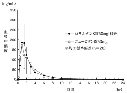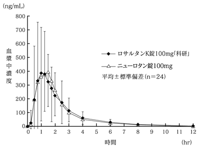 健康成人男性にロサルタンK錠100mg「科研」とニューロタン錠100mgのそれぞれ1錠(ロサルタンカリウムとして100mg)を、絶食単回経口投与して血漿中ロサルタン濃度を測定し、得られた薬物動態パラメータ(AUC)について90%信頼区間法にて統計解析を行った結果、log(0.80)~log(1.25)の範囲内であり、また薬物動態パラメータ(Cmax)について統計解析を行った結果、対数値の平均値の差がlog(0.90)~log(1.11)の範囲内であり、かつ、溶出試験で規定する全ての条件で本剤と標準製剤の溶出挙動が類似していることから、両剤の生物学的同等性が確認された(クロスオーバー法)8)。