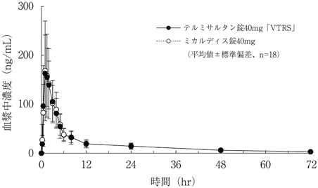 健康成人男性にテルミサルタン錠40mg「VTRS」とミカルディス錠40mgのそれぞれ1錠(テルミサルタンとして40mg)を、絶食時単回経口投与して血漿中テルミサルタン濃度を測定し、得られた薬物動態パラメータ(AUC、Cmax)について90%信頼区間法にて統計解析を行った結果、log(0.80)~log(1.25)の範囲内であり、両剤の生物学的同等性が確認された(クロスオーバー法)11)。