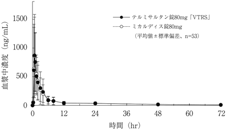 健康成人男性にテルミサルタン錠80mg「VTRS」とミカルディス錠80mgのそれぞれ1錠(テルミサルタンとして80mg)を、絶食時単回経口投与して血漿中テルミサルタン濃度を測定し、得られた薬物動態パラメータ(AUC、Cmax)について90%信頼区間法にて統計解析を行った結果、log(0.80)~log(1.25)の範囲内であり、両剤の生物学的同等性が確認された(クロスオーバー法)12)。