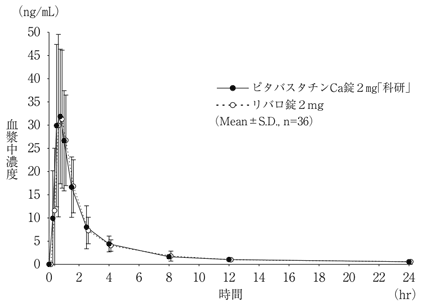 健康成人男性にピタバスタチンCa錠2mg「科研」とリバロ錠2mgのそれぞれ1錠(ピタバスタチンカルシウムとして2mg)を、絶食時単回経口投与して血漿中ピタバスタチン濃度を測定し、得られた薬物動態パラメータ(AUC、Cmax)について90%信頼区間法にて統計解析を行った結果、log(0.80)~log(1.25)の範囲内であり、両剤の生物学的同等性が確認された(クロスオーバー法)3)。
