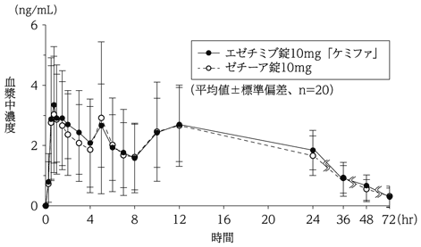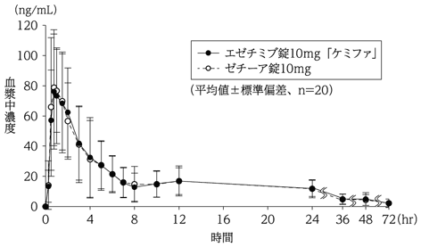 エゼチミブ錠10mg「ケミファ」とゼチーア錠10mgを、クロスオーバー法によりそれぞれ1錠(エゼチミブとして10mg)を健康成人男性に絶食単回経口投与して血漿中エゼチミブ抱合体及びエゼチミブ非抱合体濃度を測定し、得られた薬物動態パラメータ(AUC、Cmax)について90%信頼区間法にて統計解析を行った結果、log(0.80)~log(1.25)の範囲内であり、両剤の生物学的同等性が確認された8)。