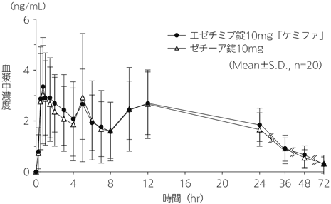 健康成人男子にエゼチミブ錠10mg「ケミファ」とゼチーア錠10mgのそれぞれ1錠(エゼチミブとして10mg)を、絶食時単回経口投与して血漿中エゼチミブ抱合体及びエゼチミブ非抱合体濃度を測定し、得られた薬物動態パラメータ(AUC、Cmax)について90%信頼区間法にて統計解析を行った結果、log(0.80)~log(1.25)の範囲内であり、両剤の生物学的同等性が確認された(クロスオーバー法)8)。