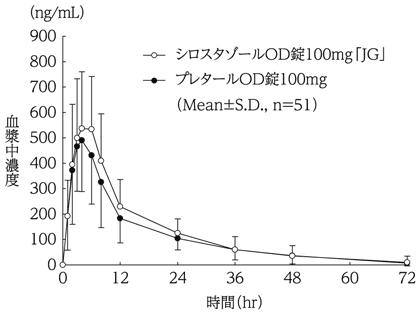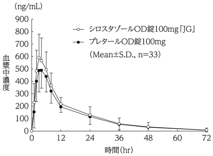 シロスタゾールOD錠100mg「JG」とプレタールOD錠100mgを、クロスオーバー法によりそれぞれ1錠(シロスタゾールとして100mg)健康成人男性に絶食単回経口投与して血漿中未変化体濃度を測定し、得られた薬物動態パラメータ(AUC、Cmax)について90%信頼区間法にて統計解析を行った結果、log(0.80)~log(1.25)の範囲内であり、両剤の生物学的同等性が確認された10)。