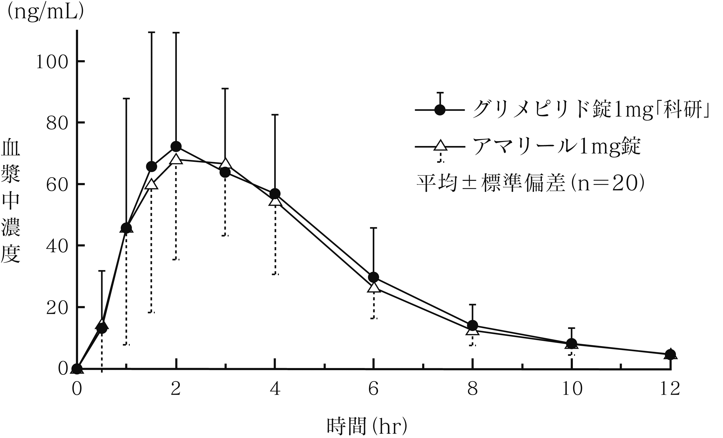 健康成人男子にグリメピリド錠1mg「科研」とアマリール1mg錠のそれぞれ1錠(グリメピリドとして1mg)を、食後単回経口投与して血漿中グリメピリド濃度を測定し、得られた薬物動態パラメータ(AUC、Cmax)について90%信頼区間法にて統計解析を行った結果、log(0.80)~log(1.25)の範囲内であり、両剤の生物学的同等性が確認された(クロスオーバー法)4) 。
