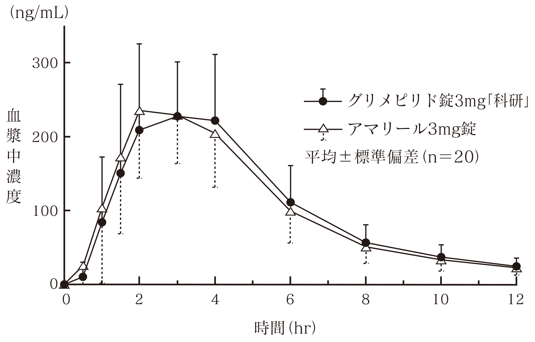 健康成人男子にグリメピリド錠3mg「科研」とアマリール3mg錠のそれぞれ1錠(グリメピリドとして3mg)を、食後単回経口投与して血漿中グリメピリド濃度を測定し、得られた薬物動態パラメータ(AUC、Cmax)について90%信頼区間法にて統計解析を行った結果、log(0.80)~log(1.25)の範囲内であり、両剤の生物学的同等性が確認された(クロスオーバー法)4) 。