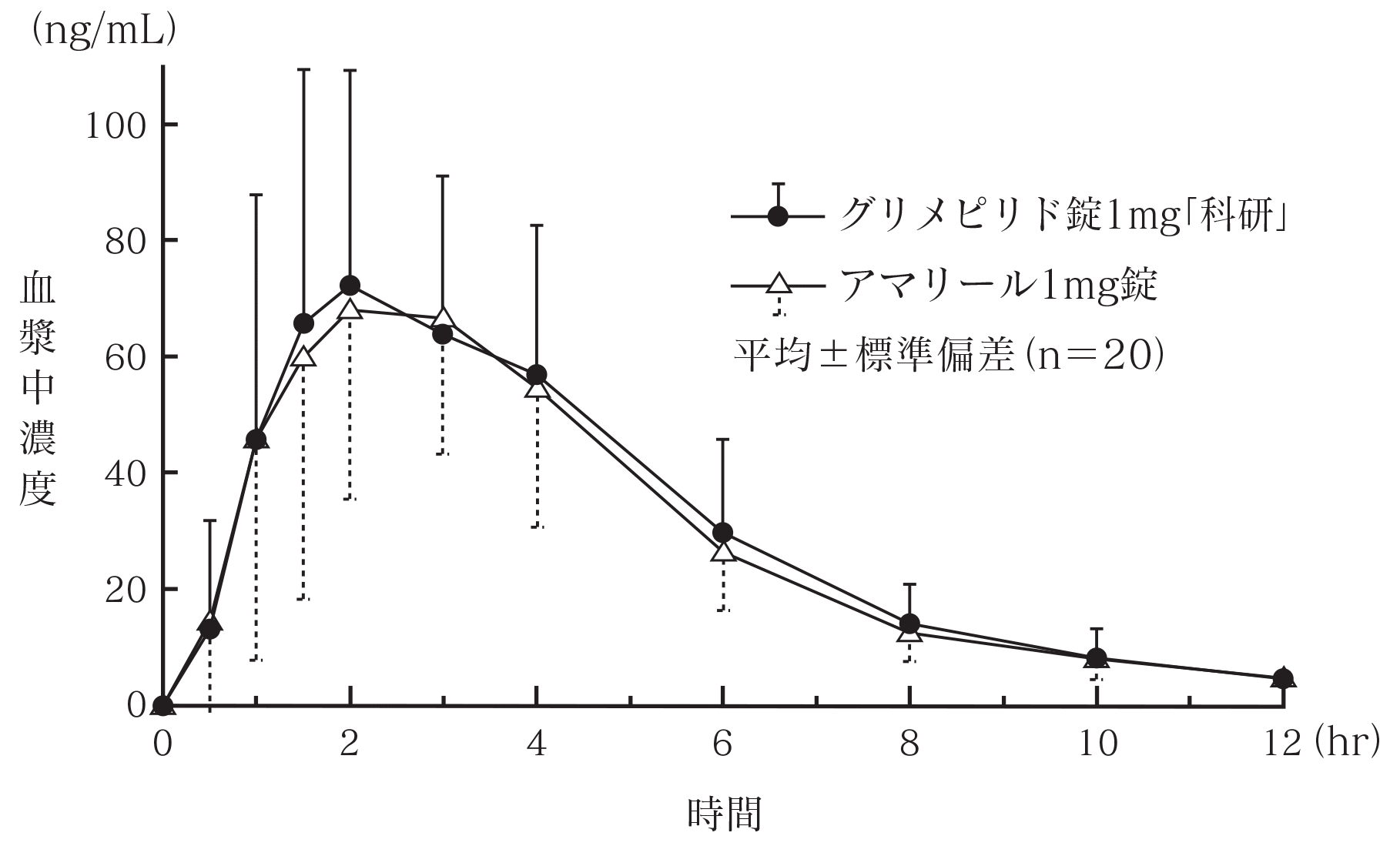 健康成人男性にグリメピリド錠1mg「科研」とアマリール1mg錠のそれぞれ1錠(グリメピリドとして1mg)を、食後単回経口投与して血漿中グリメピリド濃度を測定し、得られた薬物動態パラメータ(AUC、Cmax)について90%信頼区間法にて統計解析を行った結果、log(0.80)~log(1.25)の範囲内であり、両剤の生物学的同等性が確認された(クロスオーバー法)4) 。