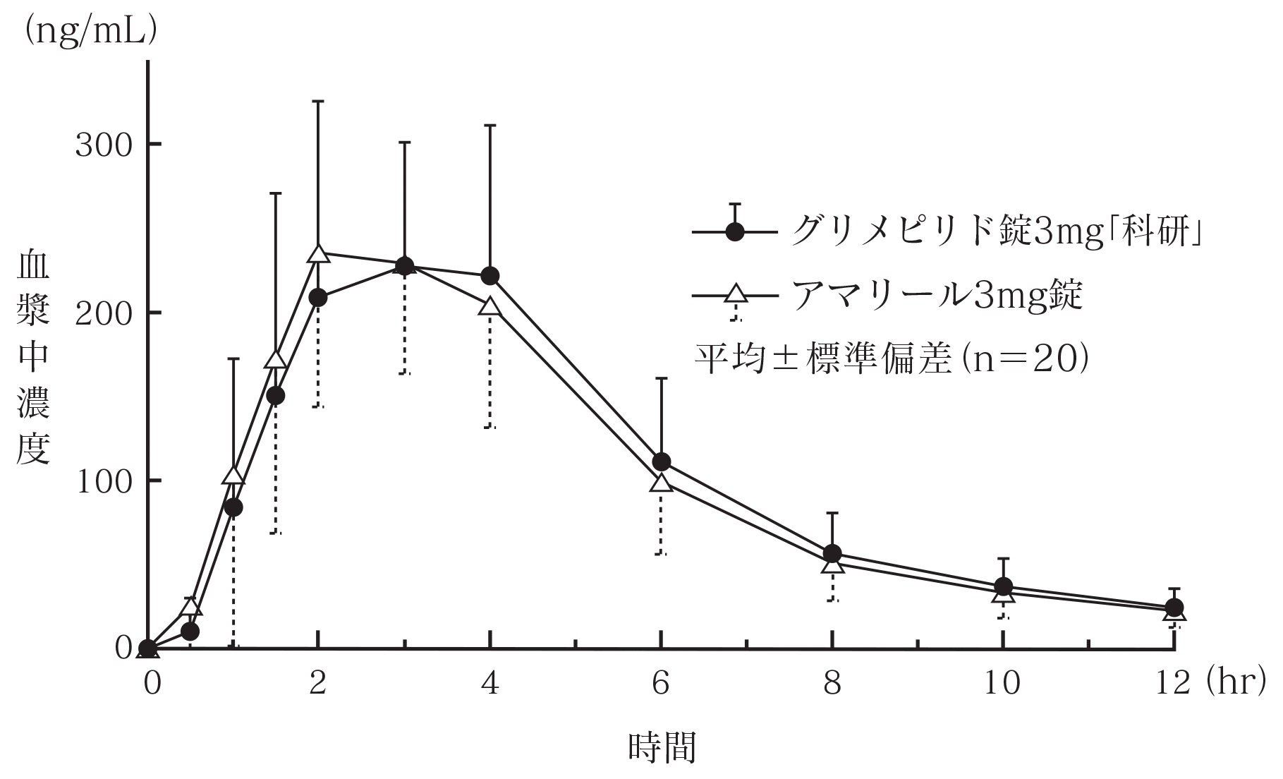 健康成人男性にグリメピリド錠3mg「科研」とアマリール3mg錠のそれぞれ1錠(グリメピリドとして3mg)を、食後単回経口投与して血漿中グリメピリド濃度を測定し、得られた薬物動態パラメータ(AUC、Cmax)について90%信頼区間法にて統計解析を行った結果、log(0.80)~log(1.25)の範囲内であり、両剤の生物学的同等性が確認された(クロスオーバー法)4) 。
