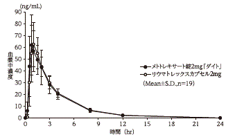 健康成人男性にメトトレキサート錠2mg「ダイト」1錠とリウマトレックスカプセル2mg 1カプセル(メトトレキサートとして2mg)を、絶食時単回経口投与して血漿中メトトレキサート濃度を測定し、得られた薬物動態パラメータ(AUC、Cmax)について90%信頼区間法にて統計解析を行った結果、log(0.80)~log(1.25)の範囲内であり、両剤の生物学的同等性が確認された(クロスオーバー法)4) 。