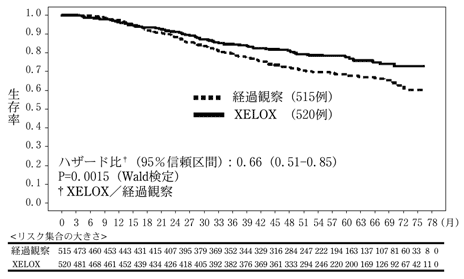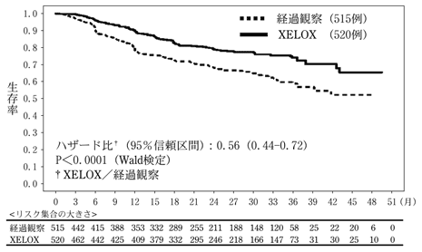 外科的切除が実施されたStageⅡ/Ⅲの胃癌患者(1,035例)を対象に、経過観察とXELOX療法(本剤とオキサリプラチン併用)を比較する試験を実施した(本剤:1,000mg/m2 1日2回、14日間投与・7日間休薬)。無病生存期間を主要評価項目、全生存期間を副次的評価項目とした。その結果、経過観察に対するXELOX療法の優越性が認められた29),30)。