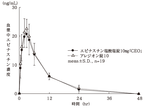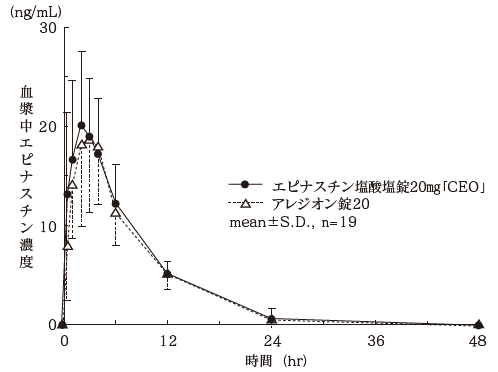 健康成人男性にエピナスチン塩酸塩錠10mg「CEO」又はエピナスチン塩酸塩錠20mg「CEO」とアレジオン錠10又はアレジオン錠20をそれぞれエピナスチン塩酸塩として20mgをクロスオーバー法により絶食時に単回経口投与して血漿中エピナスチン濃度を測定し、得られた薬物動態パラメータ(AUC、Cmax)について統計解析を行った結果、両剤の生物学的同等性が確認された2),3)。