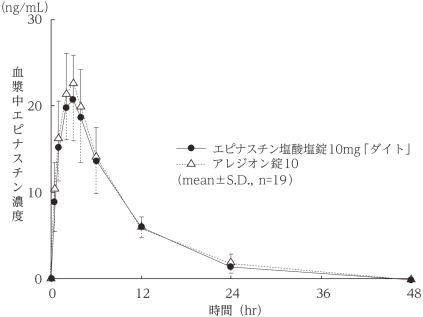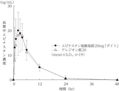 健康成人男性にエピナスチン塩酸塩錠10mg「ダイト」又はエピナスチン塩酸塩錠20mg「ダイト」とアレジオン錠10又はアレジオン錠20をそれぞれエピナスチン塩酸塩として20mgをクロスオーバー法により絶食時に単回経口投与して血漿中エピナスチン濃度を測定し、得られた薬物動態パラメータ(AUC、Cmax)について統計解析を行った結果、両剤の生物学的同等性が確認された2),3)。