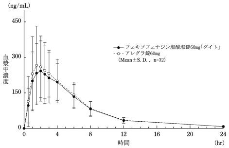健康成人男性にフェキソフェナジン塩酸塩錠60mg「ダイト」とアレグラ錠60mgのそれぞれ1錠(フェキソフェナジン塩酸塩として60mg)を、絶食時単回経口投与して血漿中フェキソフェナジン濃度を測定し、得られた薬物動態パラメータ(Cmax、AUC)について90%信頼区間法にて統計解析を行った結果、log(0.80)~log(1.25)の範囲内であり、両剤の生物学的同等性が確認された(クロスオーバー法)4)。
