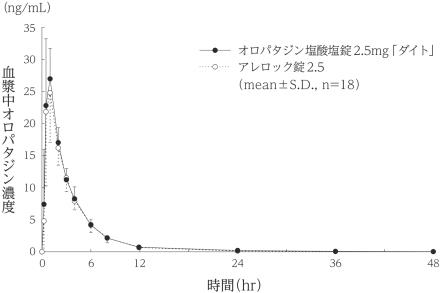 健康成人男性にオロパタジン塩酸塩錠2.5mg「ダイト」とアレロック錠2.5それぞれ1錠(オロパタジン塩酸塩として2.5mg)をクロスオーバー法により絶食単回経口投与して血漿中オロパタジン濃度を測定し、得られた薬物動態パラメータ(AUC、Cmax)について90%信頼区間法にて統計解析を行った結果、log(0.80)~log(1.25)の範囲内であり、両剤の生物学的同等性が確認された3)。