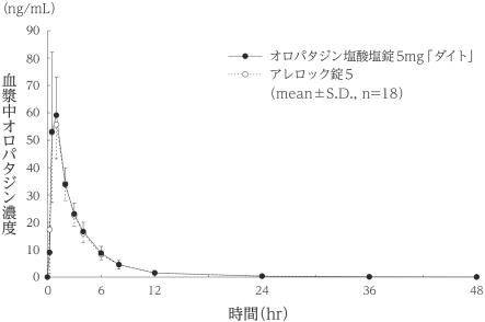 健康成人男性にオロパタジン塩酸塩錠5mg「ダイト」とアレロック錠5それぞれ1錠(オロパタジン塩酸塩として5mg)をクロスオーバー法により絶食単回経口投与して血漿中オロパタジン濃度を測定し、得られた薬物動態パラメータ(AUC、Cmax)について90%信頼区間法にて統計解析を行った結果、log(0.80)~log(1.25)の範囲内であり、両剤の生物学的同等性が確認された3)。