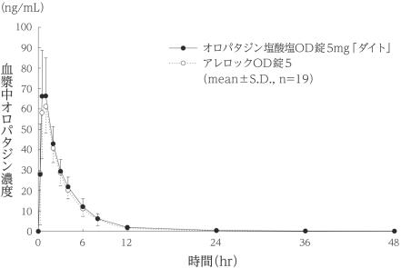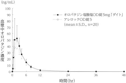 健康成人男性にオロパタジン塩酸塩OD錠5mg「ダイト」とアレロックOD錠5それぞれ1錠(オロパタジン塩酸塩として5mg)をクロスオーバー法により絶食単回経口投与して血漿中オロパタジン濃度を測定し、得られた薬物動態パラメータ(AUC、Cmax)について90%信頼区間法にて統計解析を行った結果、log(0.80)~log(1.25)の範囲内であり、両剤の生物学的同等性が確認された3)。