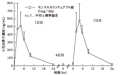 健康成人にモンテルカストチュアブル錠5mgを食後投与することにより空腹時に比べて最高血漿中濃度到達時間(Tmax)は2.3±0.9時間から4.0±1.9時間に遅延した。また、Cmaxは488±66ng/mLから256±82ng/mLに48%減少し、AUC0-∞は2730±743ng・hr/mLから2386±498ng・hr/mLに13%減少した7) (外国人データ)。