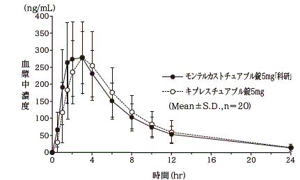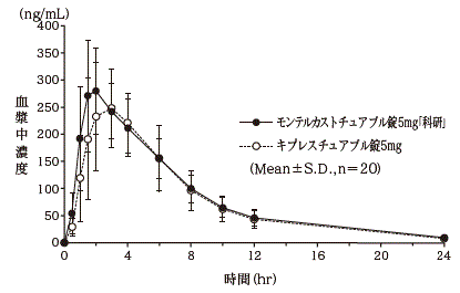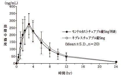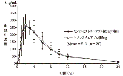 健康成人男性にモンテルカストチュアブル錠5mg「科研」とキプレスチュアブル錠5mgのそれぞれ1錠(モンテルカストとして5mg)を、絶食時単回経口投与して血漿中モンテルカスト未変化体濃度を測定し、得られた薬物動態パラメータ(AUC、Cmax)について90%信頼区間法にて統計解析を行った結果、log(0.80)~log(1.25)の範囲内であり、両剤の生物学的同等性が確認された(クロスオーバー法)6) 。