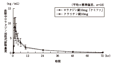 ロラタジン錠10mg「ケミファ」とクラリチン錠10mgを、クロスオーバー法によりそれぞれ1錠(ロラタジンとして10mg)健康成人男性に絶食単回経口投与して血漿中ロラタジン活性代謝物濃度を測定し、得られた薬物動態パラメータ(AUC、Cmax)について90%信頼区間法にて統計解析を行った結果、log(0.80)~log(1.25)の範囲内であり、両剤の生物学的同等性が確認された3) 。
